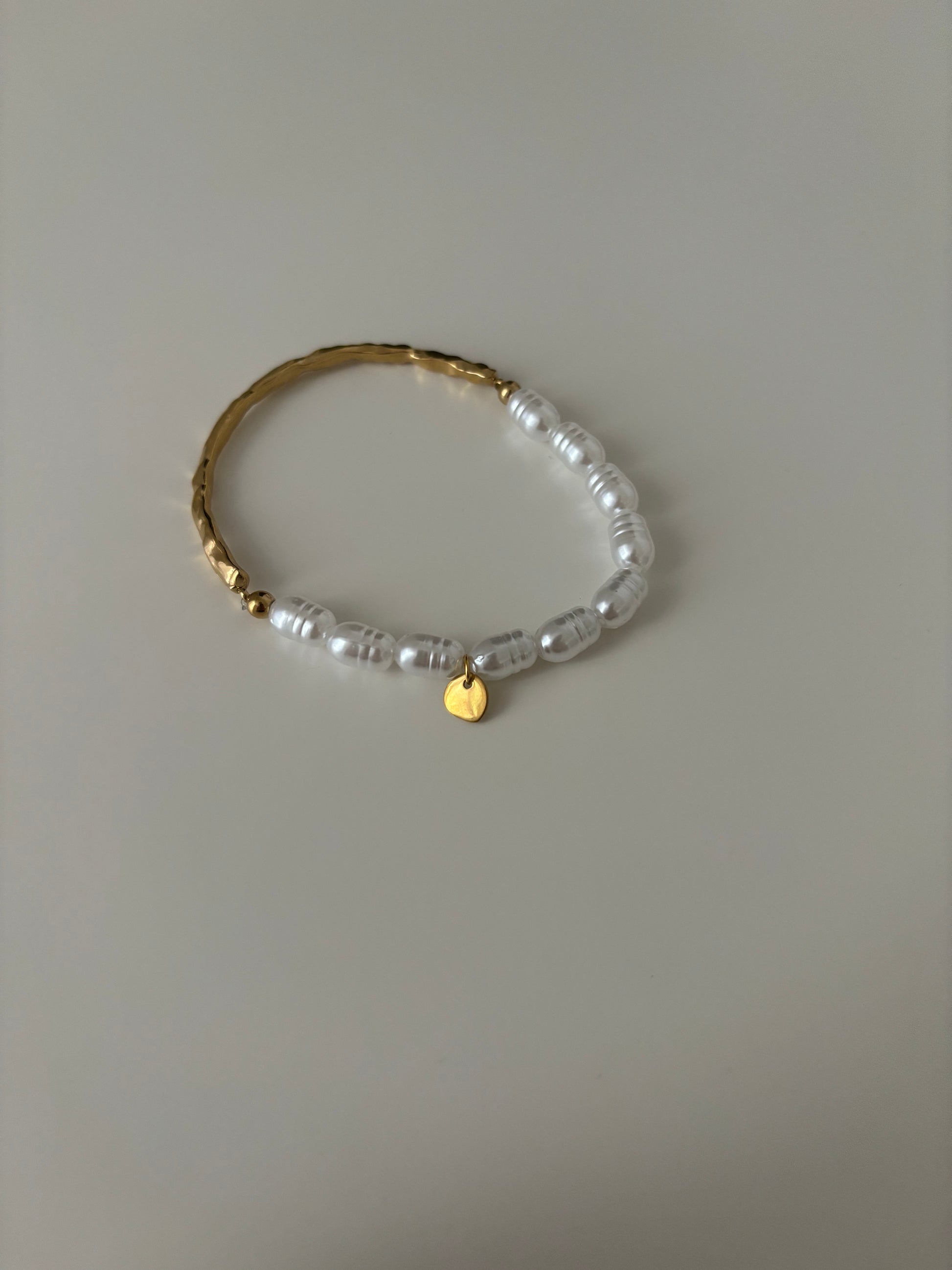 Bracelet mi jonc doré mi perles synthétiques. En acier inoxydable. La partie perle est extensible il est donc facile à enfilé ☺️